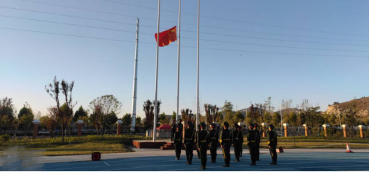 升旗仪式由张鹏老师主持,7点10分升旗仪式正式开始,迎着朝阳,国旗护卫队的队员们以饱满的精神状态护送着鲜艳的五星红旗走向升旗台。当雄壮有力的《义勇军进行曲》慢慢响彻校园时,全体师生面向冉冉升起的五星红旗致敬,心中满怀激动与自豪。