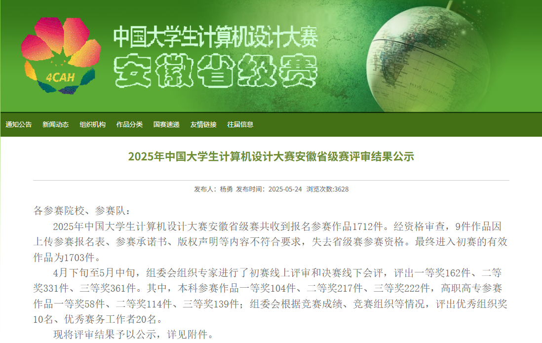 pp电子pp电子游戏官网学子在2025年中国大学生计算机设计大赛安徽省级赛中表现亮眼,凭借扎实的专业功底与创新实践能力,斩获多项荣誉。本次大赛中,pp电子学生共获得一等奖3项、二等奖3项、三等奖1项。取得了获一等奖数在全省参赛的43所本科高校并列第9名好成绩。其中4项作品被推荐参加在7月和8月份举行的全国总决赛。