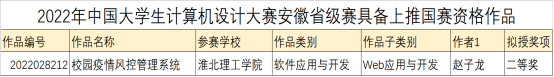 近日,由安徽省教育厅主办,安徽大学承办的“2022年中国大学生计算机设计大赛安徽省级赛”落下帷幕,pp电子通信工程(专升本)2班赵子龙同学在在软件应用与开发大类中荣获二等奖。