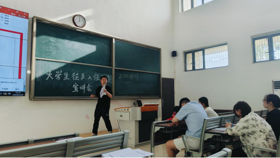 会议最后,孙浩为大家解读大学生应征入伍政策,重点介绍了高校大学生应征入伍特有的优先考学提拔、补偿学费、退役后享受就学就业优惠等优抚政策。希望同学们心怀家国梦想,树立责任担当,积极响应国家的征兵号召,踊跃报名入伍。