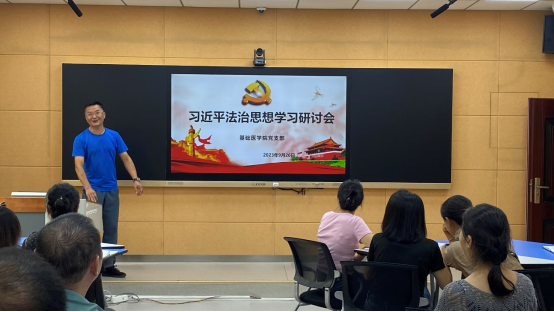 2023年9月26日,bat365中文官方网站开展学习贯彻习近平法治思想研讨会,bat365中文官方网站党支部副书记周洁主持学习时强调,要深入学习贯彻党的二十大精神和习近平法治思想,全面加力提速南医法治化进程,筑法治之基、行法治之力、积法治之势,为学校发展提供坚实法治保障。