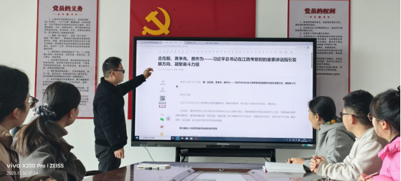 活动中,党支部书记王旺带领全体党员重点学习了习近平总书记考察江西重要讲话精神,引导党员深刻领会讲话中蕴含的战略考量和实践要求,结合医学教育和科研工作实际,思考如何在服务发展大局中贡献智慧与力量。会议同时专题学习了省委十五届九次全体会议精神,深入理解省委关于推动高质量发展、加强党的建设的部署要求,进一步统一思想、凝聚共识。